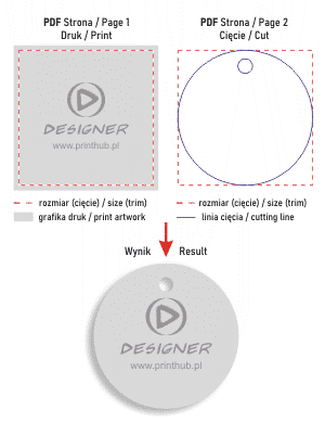 (der gedruckte Hintergrund muss 4 mm größer sein als die endgültige Produktgröße) - Auf der zweiten Seite des PDF-Dokuments - platzieren Sie die Vektorkontur des Schnitts mit Löchern, mit einer blauen Linie erstellt